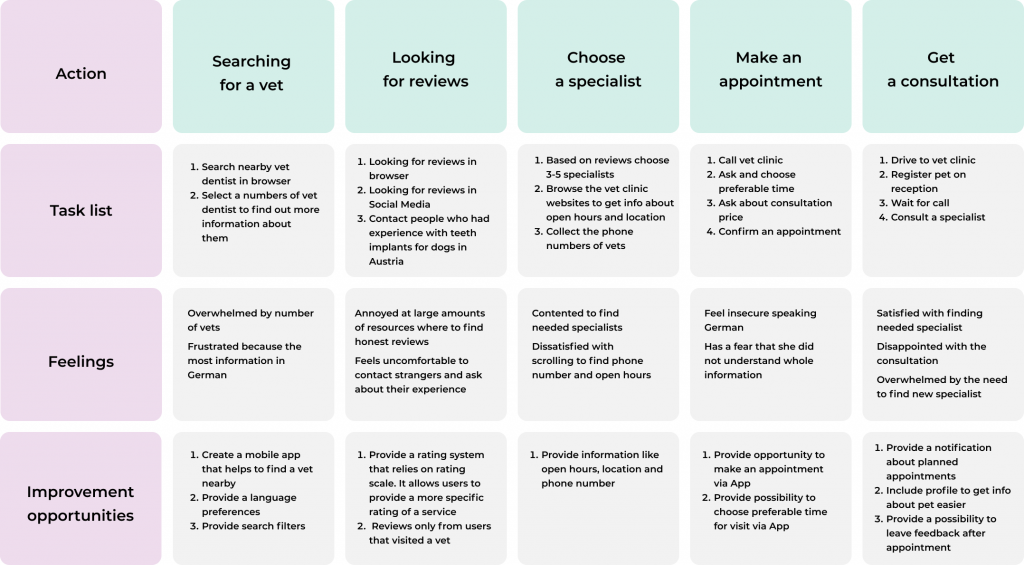 I created a scenario where the user has goals and expectations in using veterinary applications and this user journey map helps to understand how users are thinking, feeling, seeing, hearing, and doing. And how to make it easier for users to achieve their goals and how this opportunities could be developed in the designing phase further.