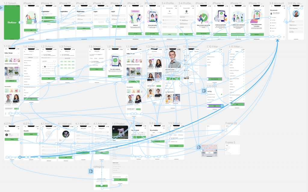 I made a prototype consisting of several frames and there are tasks that users can do such as scheduling visit to veterinarian, reading reviews, looking for doctors/clinics in an area and using filters, adding pets, creating profile and others.
